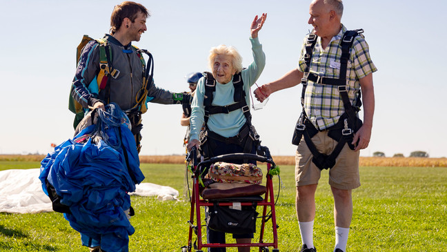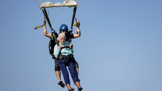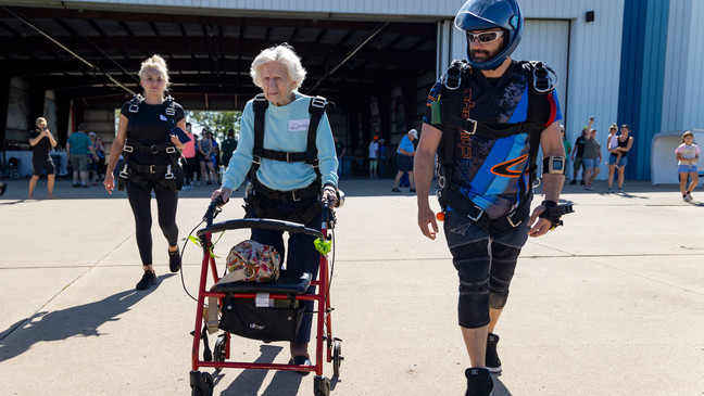 On Oct. 1, Hoffner made a tandem skydive that could land her in the record books as the world's oldest skydiver. She jumped out of a plane from 13,500 feet (4,100 meters) at Skydive Chicago in Ottawa, Illinois, 85 miles (140 kilometers) southwest of Chicago.