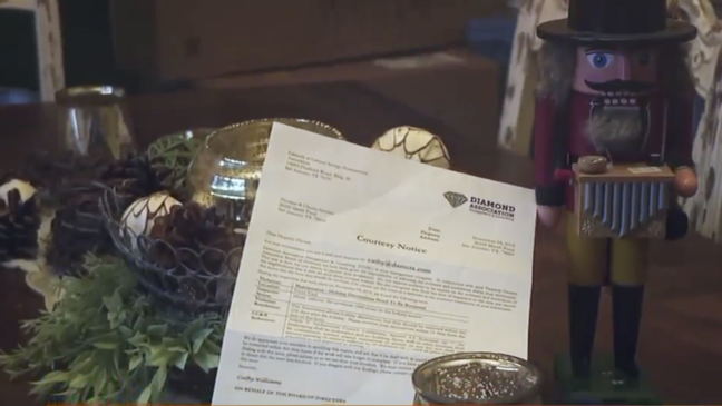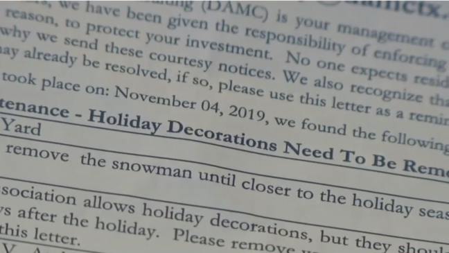 "I just found it crazy." added Claudia. "Especially that they didn’t give us a time. Like, when is the right time to put it?" Nick and Claudia say they have no plans to take down the decorations. "We're not going to do it," said Nick. "It's the Christmas spirit. We're not going to be forced by the HOA to take it down."